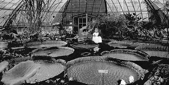 This photograph from around 1900 shows a little girl (probably the daughter of the Professor of Botany) sitting on the leaf of Victoria amazonica, the world's largest water lily, in the recently opened Victoria greenhouse.